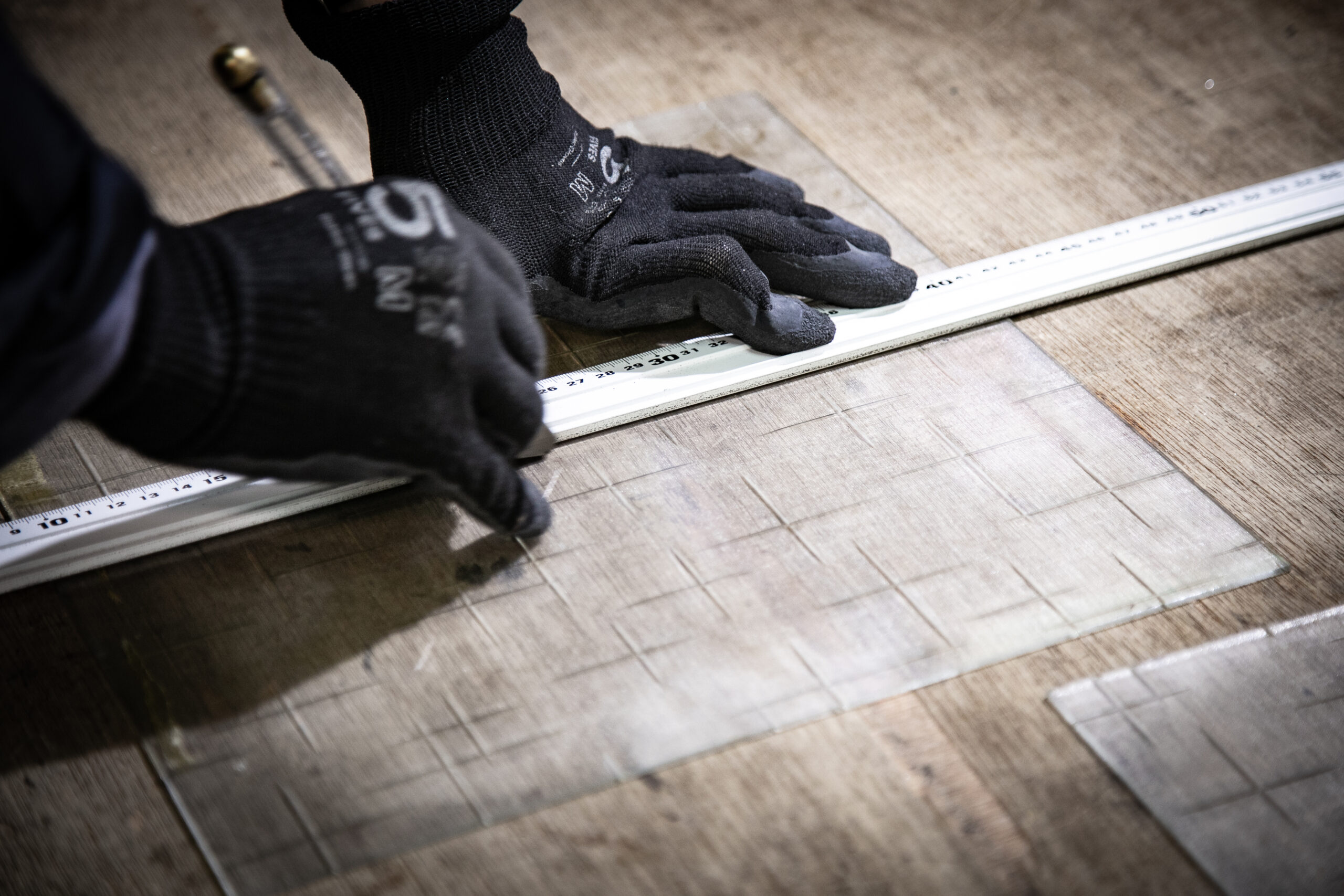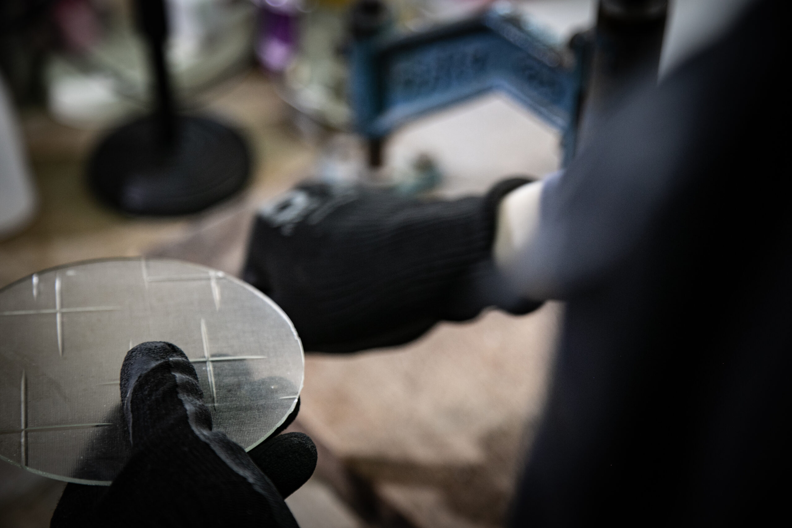 ひとつの大きなガラス板から、無駄なく、美しく。そこにも職人の感覚が光ります。