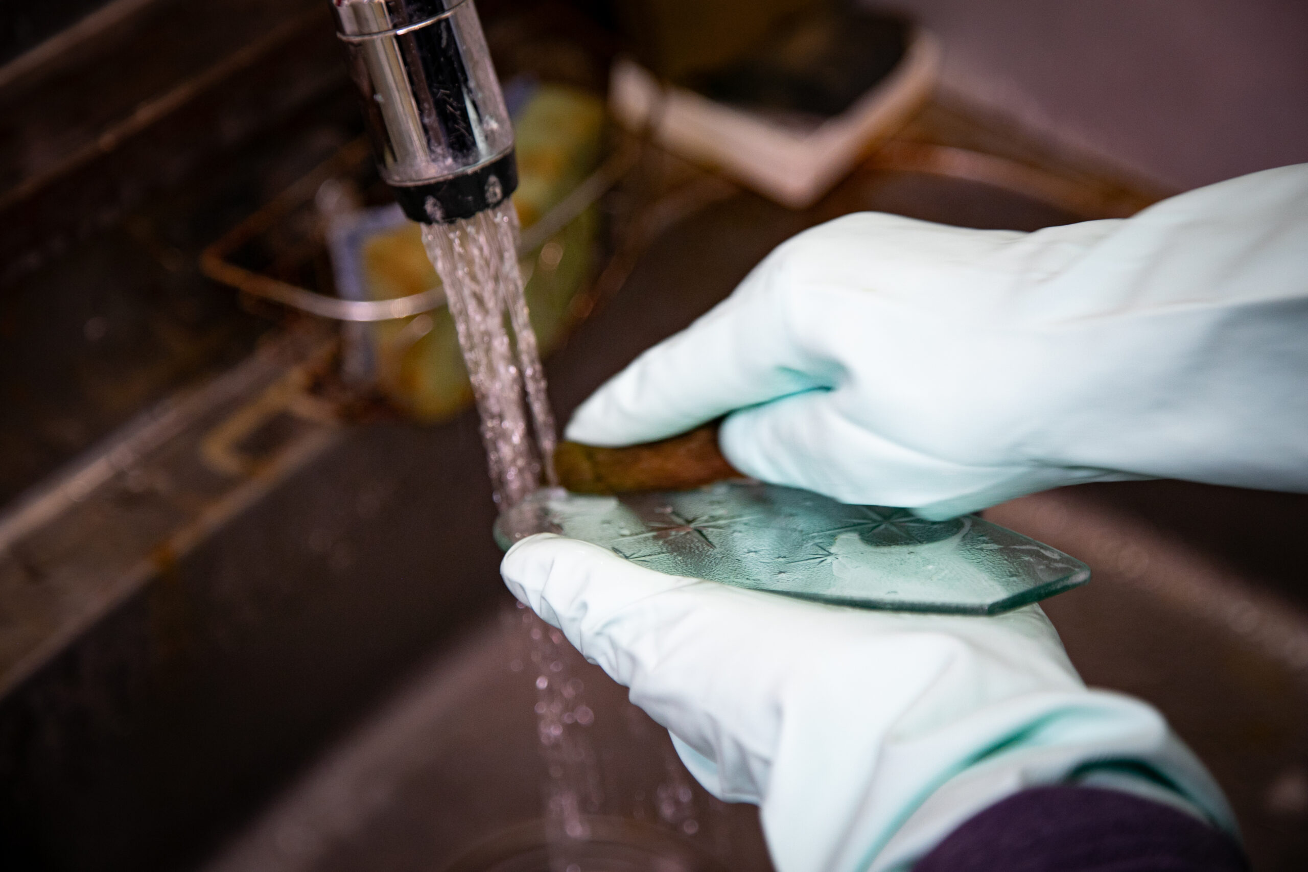 その表面についた汚れや埃を、ひとつひとつ丁寧に洗い落としていきます。すると、素材本来の透明感と輝きが、静かに姿を現します。