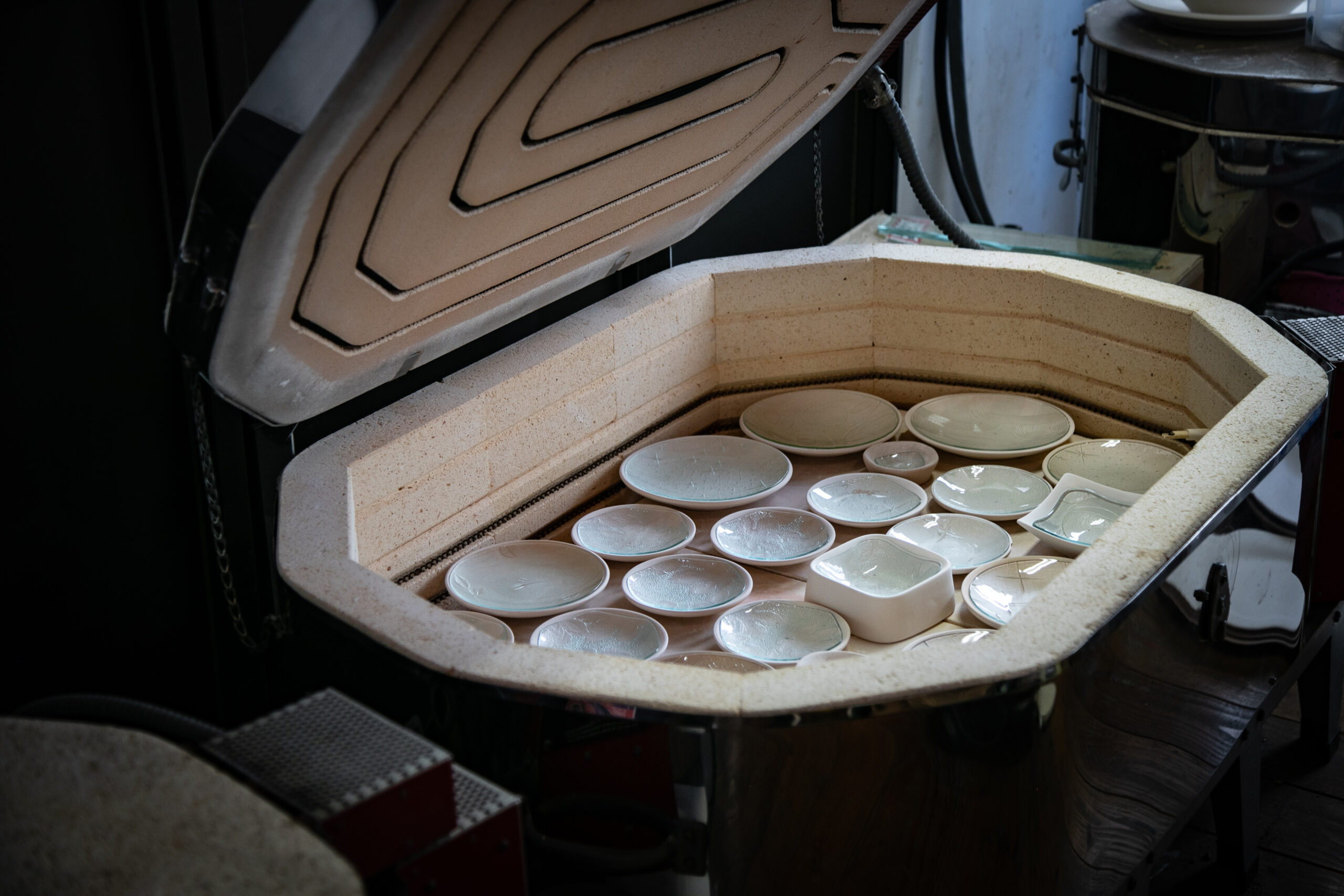 型にガラスをのせ、窯の中でゆっくりと加熱します。高温の熱によって自然にガラスがたわみ、やわらかな曲線を描いて器のかたちへ。